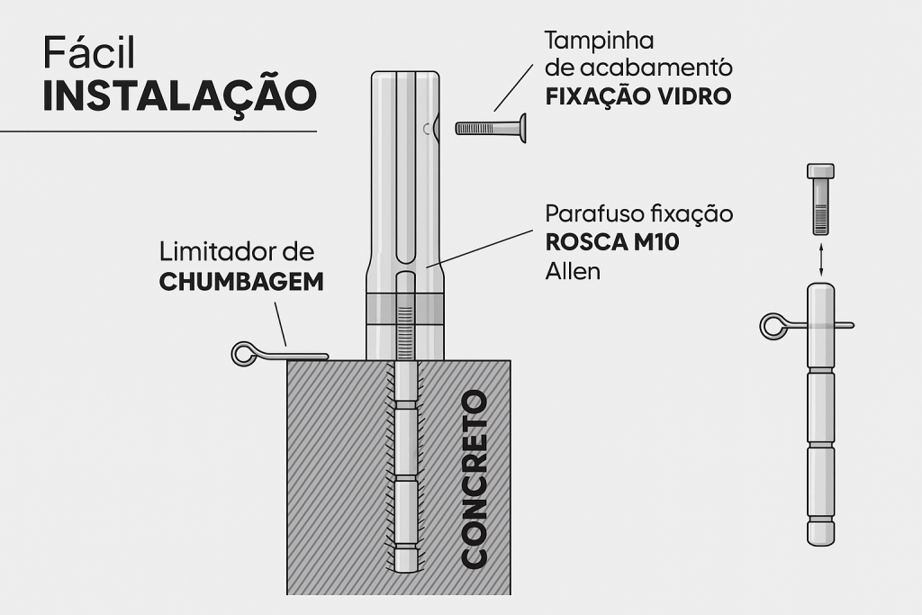 Compatível com vidro 8–10 mm. Fixação lateral com 2 parafusos. Alta aderência.