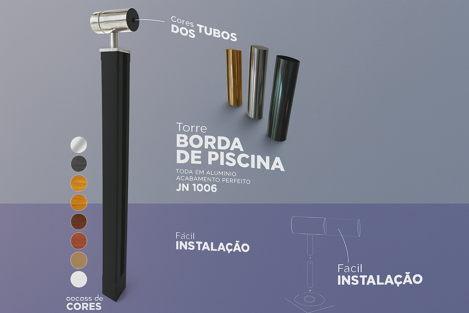 Alumínio extrudado. Pintura eletrostática (diversas cores). Ideal para borda de piscina.